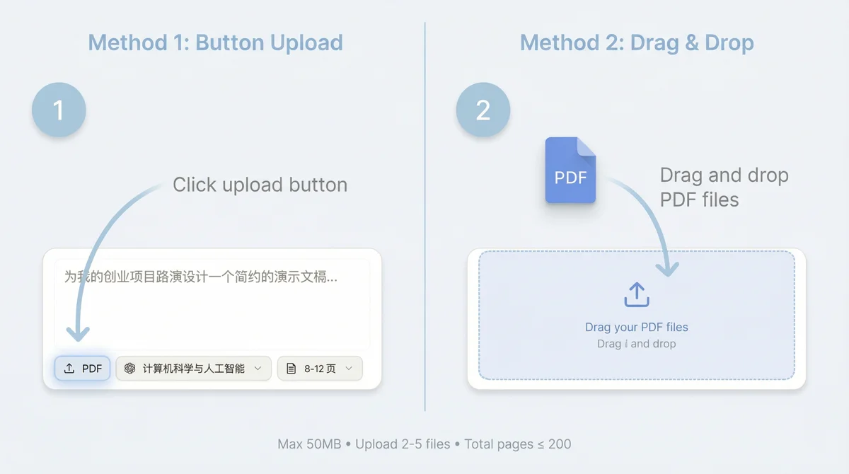 Drag and drop your PDF file or click the upload button. Supports files up to 50MB, or upload multiple files (2-5) with up to 200 pages total.